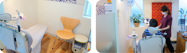 診療スペースは患者さん同士が見えないように半透明のパーティションで仕切られ診療ユニットからは外の気配が感じられます。お子さまの診療中は、ご家族の方も同席されても大丈夫なようにゆったりとしたスペースをとってあります。