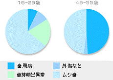 左図のように、歯を失う原因のほとんどが虫歯と歯周病です。その他には、外傷(交通事故など)などがあります。