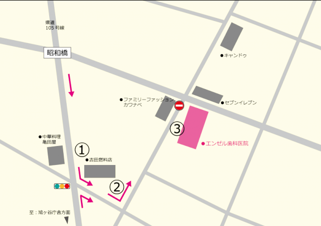 ①昭和橋の交差点近くの県道105号線沿いの道を曲がってください。