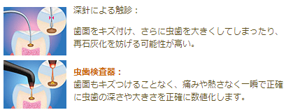 鋭利な器具で歯に触れないので、歯を痛めず、痛みもなく、歯の状態を調べることができます。歯を削る必要のない軽度の虫歯の経過観察もできる虫歯探しのエキスパートです。