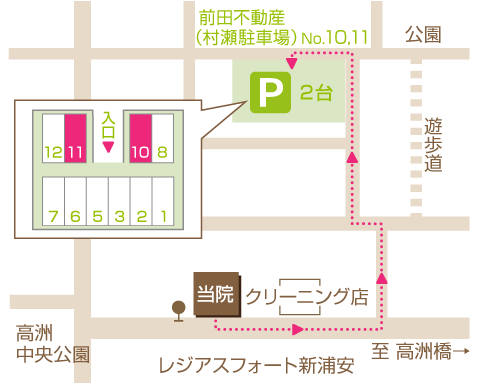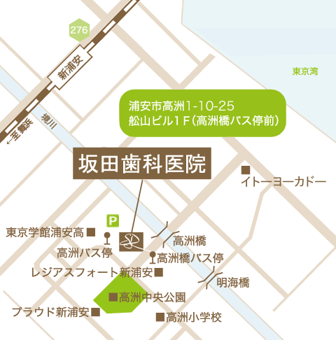 [ 電車・バスでお越しの方 ] JR京葉線 新浦安駅 南口 系統18番 高洲橋 バス停前0分 系統15番 高洲 バス停2分 [ 車でお越しの方 ] 首都高速新浦安出口から約5分 駐車場有り