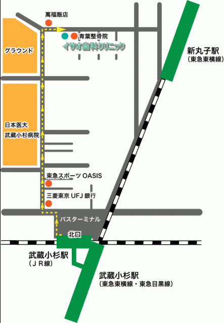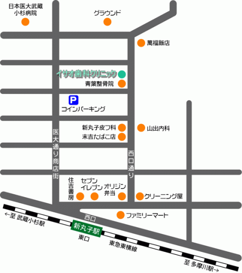 神奈川県川崎市新丸子の歯医者、イサオ歯科クリニックは、東急東横線・新丸子駅より徒歩3分、西口通り沿いです。バスでお越しの方は武蔵小杉駅・北口ロータリーより徒歩7分です。お車でお越しの方は周辺コインパーキングをご利用ください。