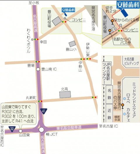 ●バスでお越しの場合 ・栄 (トヨヤマタウンバス) 噴水の北のバス停→33分→「豊山町役場前」 ・名古屋駅 (あおい交通バス) ミッドランドスクエアーの前のバス停→18分→「豊山町役場前」 ●車でお越しの場合 ・名古屋高速「豊山南インター」をおり、R41号へ入る。 ・東名阪自動車道「山田東」からR41号へ入る。