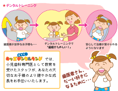 ▲待合室「最初に通う歯医者さんのイメージが良ければ、その子供は一生歯の治療を怖がらない」という考えに基づき、まるでオモチャ屋さんのような外観同様、院内も子供たちの恐怖心を取り除く仕掛けが一杯。全員女性のスタッフは白衣ではなくカラフルなポロシャツ姿。パステル調のやさしいカラーで統一されたインテリアには、可愛いキャラクターの絵があちこちに出現。動物柄の診察台の前にはアニメも見られるテレビが設置され、子供たちの緊張感をなくし、楽しく治療を受けられる工夫が…。さらに、麻酔を“おまじない”と呼んだり、注射器は子供の視界に入らないように取り扱うなど、言葉選びや対応にも細心の注意を払っています。