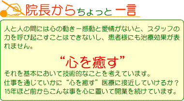 お話し、気持ちをよく伺い、その人にとって何が大切なことか、パーソナルに考えています。『全ての人の笑顔のために』