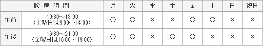 | 診療時間 | 月・火10:30~13:00、16:30~21:00 (13:00~16:30は昼休み) 木16:30~21:00 金10:30~13:00、16:00~19:00 (13:00~16:00は昼休み) 土9:00~14:00、 |