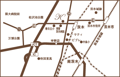 JR京都線(東海道線)茨木駅下車、西出口ロータリーから西へ徒歩7分。三菱東京UFJ銀行、三井住友銀行を過ぎ、西駅前交差点歩道橋を渡ります。向かいの茨木郵便局を過ぎ、しばらくしますと当院に到着いたします。