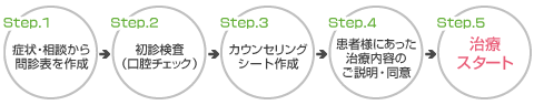 当院では、治療を行う前にカウンセリングを行っております。患者様の症状、希望する治療についてお話を聞かせていただき、初診検査の結果を基に、患者様にあった治療方針をカウンセリングシートとして作成いたします。そして、その治療方針の説明を十分に行い、患者様の同意を頂いてから治療をスタートいたします。