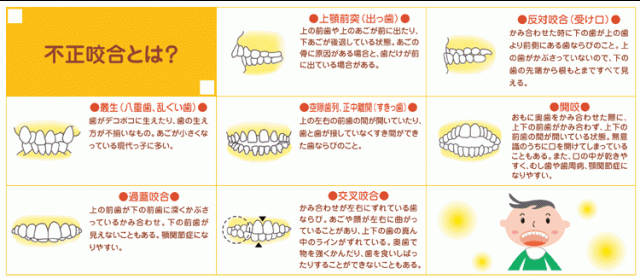 不正咬合とは、見た目上歯並びが悪いだけでなく、上下それぞれの歯が異なった場所で噛み合い、その役割が機能しない状態です。不正咬合には、上あごと下あごの位置がずれている骨格性のもの、歯とあごの大きさのバランスが悪いことによって、歯にでこぼこやすきまが生じる歯性のものなど様々な種類があります。