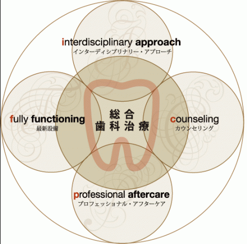また「インターディシプリナリー・アプローチ」を行っております。インターディシプリナリー・アプローチとは補綴、歯周病、矯正、外科などの各専門医が治療技術の高度なレベルで専門的に連携し一口腔単位を総合的にとらえなが治療のゴールを目指す取り組みです。 各分野のエキスパートが考え抜いた治療計画は無駄がなく、患者様の歯を必要に削らず、またそれぞれの治療の順序やタイミングを的確におこなうことで治療期間を短くし患者様への負担を減らすことができます。そして最高の治療結果を患者様に提供することが可能になります。