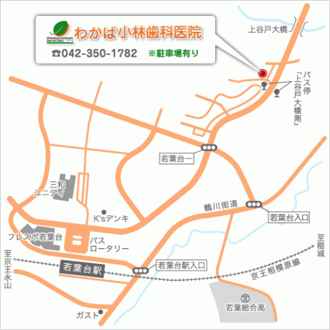 京王線「若葉台」駅より 徒歩約12分もしくは 京王バス「稲城駅行き」バスで3つ目、「上谷戸大橋南」停留所前